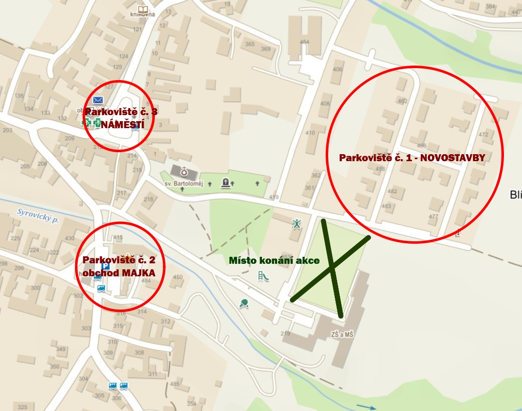 parkoviště u hřiště bude uzavřené, je třeba zaparkovat jinde - 3 vytyčené plochy: 1.) parkoviště u novostaveb, 2.) parkoviště u Majky, 3.) parkoviště na náměstí - viz. přiložená mapa níže
