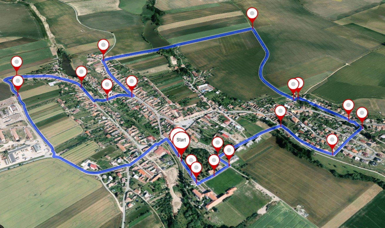 Na přiložené mapě lze vidět trasu závodu. Jeden okruh měří 5 km, start a cíl jsou na příjezdové cestě ke škole. Běží se směrem od školy ke Žlebům, tudy přes eurocestu k domu Řiháčkových. Zde se zahne dolů z kopce a dále se odbočí u "Liďáku" směr na Budín. U vodojemu se zahne vlevo a průběžně kolem družstva, ABčka, zdravotního střediska a Majky zpět ke škole.